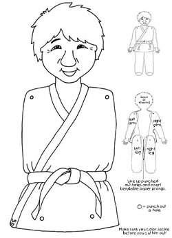 Hey kids! Here's a fun project for you - a Jumping Jackie! All you have to do is print the pages, color them, cut them out, and attach the arms and legs with bending paper prongs. We suggest printing the pages out onto heavy paper (or tracing them onto heavy paper) and coloring them before you cut them out. You will see the insertion points for the prongs on the printout. If you make a Jumping Jackie, send us your photo with your project and we'll post it here at our Jumping Jackie page! (Email your photo to jckids@jackiechan.com). |